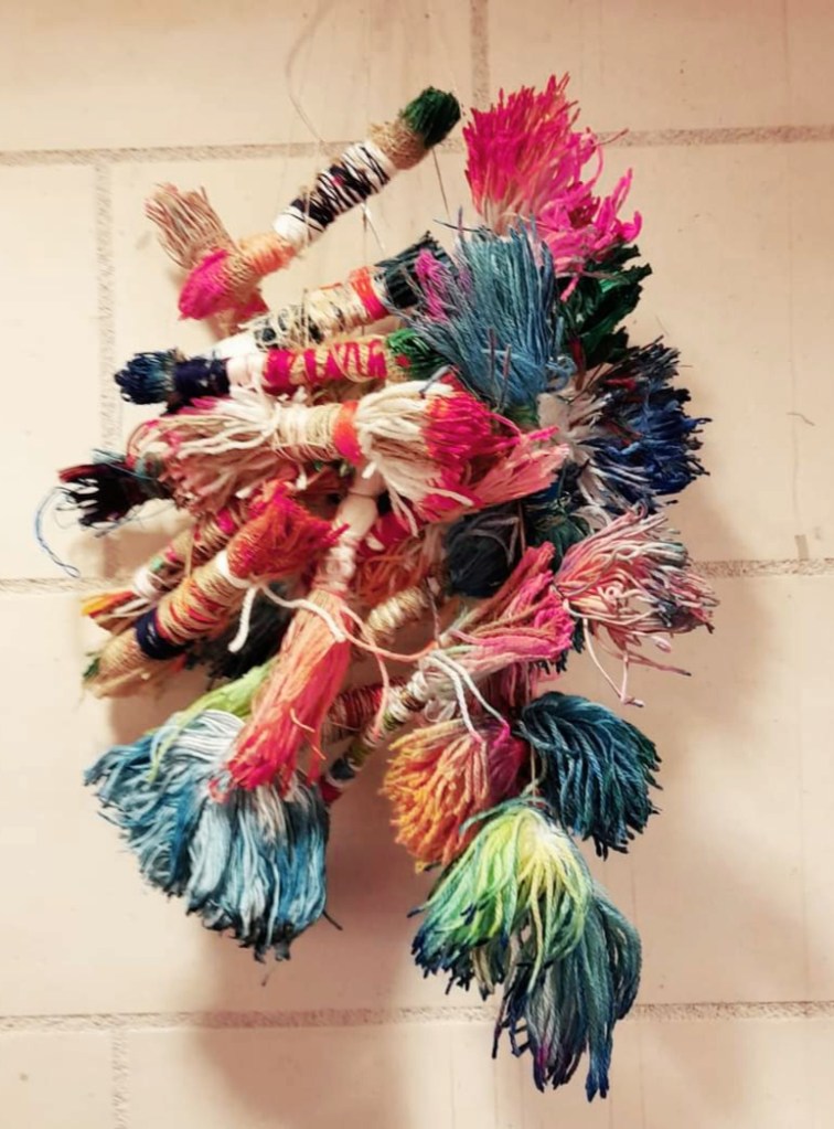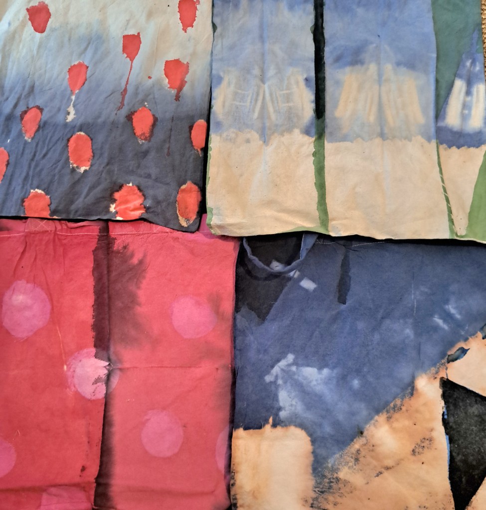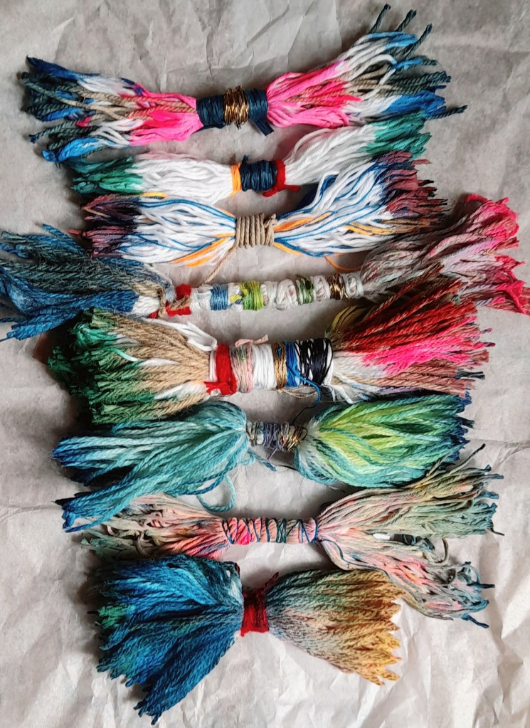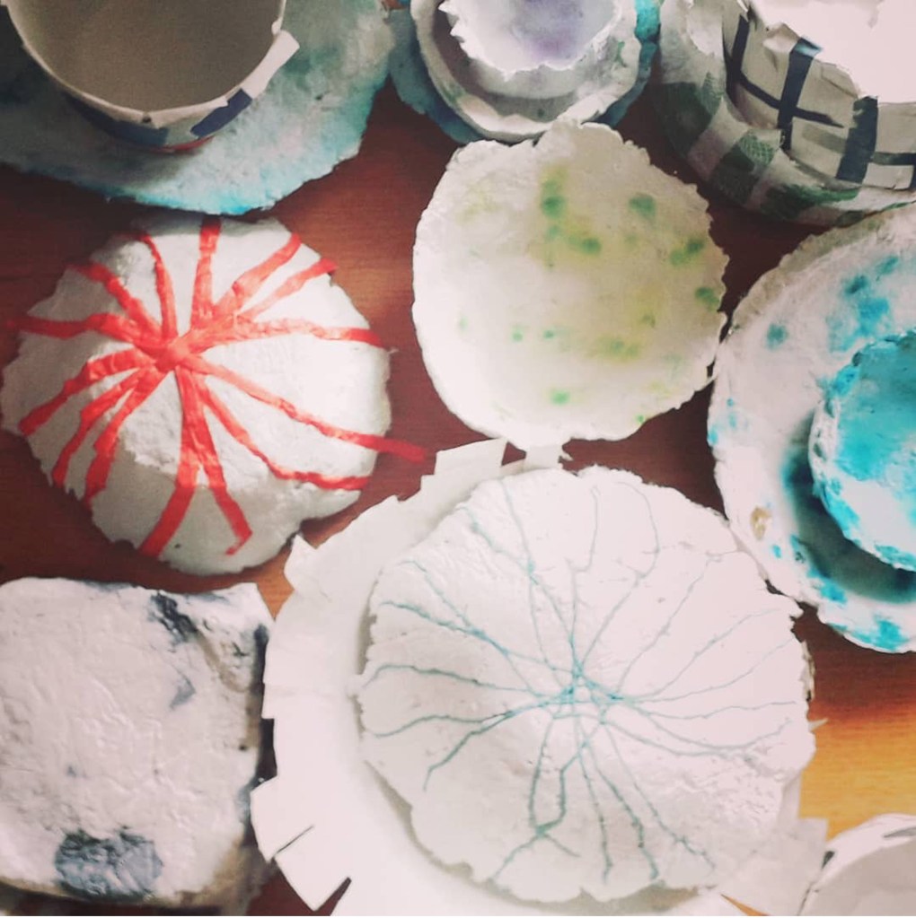 ( pâte à papier, plâtre, fils à coudre, lin, bois, tissu, coton, laine, teinture etc.)